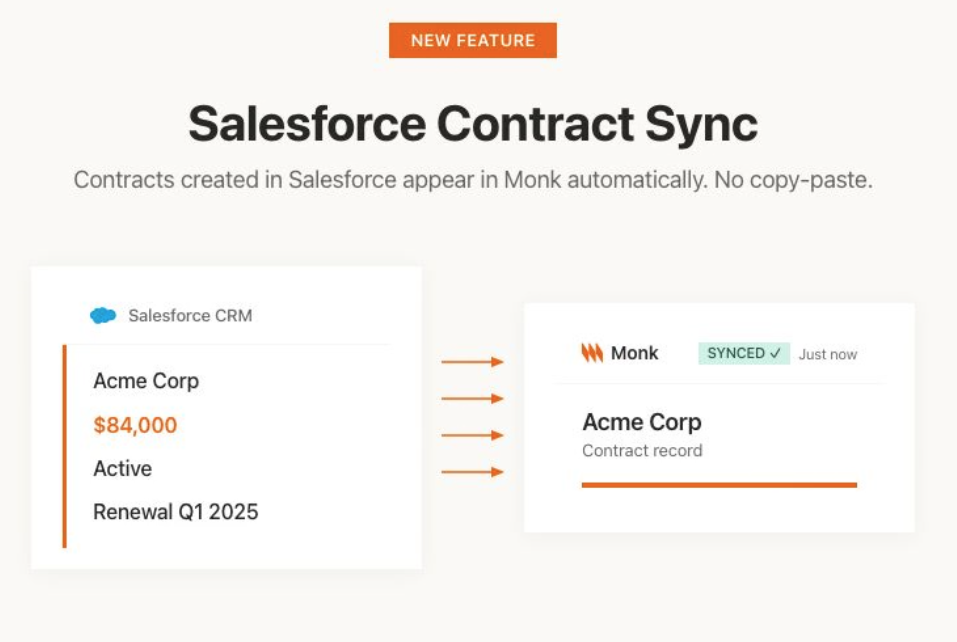The Salesforce integration is the starting point for everything else Monk does. A deal closes, the contract gets extracted, billing gets set up, invoices go out, collections start. Every step depends on that first handoff being accurate.